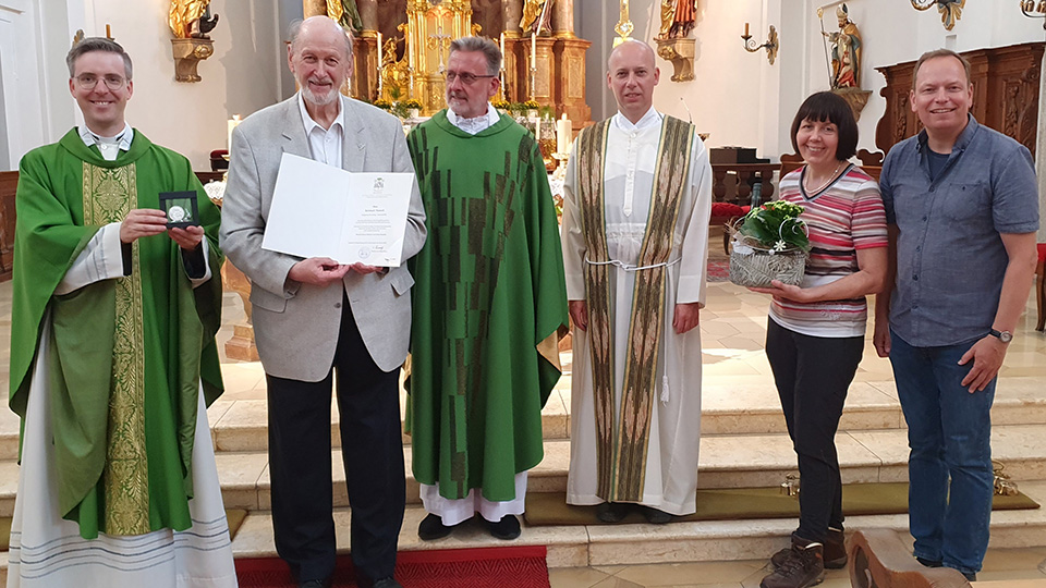 Verdienter Beifall zum Abschluss des Sonntagsgottesdienstes in der Stadtpfarrkirche St. Georg nach dem Pilgern zwischen den Kirchen der Pfarreiengemeinschaft: Im Namen von Bischof Rudolf Voderholzer verlieh Stadtpfarrer Thomas Kopp die Bischof-Johann-Michael-von-Sailer-Medaille an Reinhard Paetzold. Dies sei die höchste bischöfliche Auszeichnung für den Einsatz von Weltchristen auf Pfarrebene, unterstrich Kopp deren Bedeutung.
