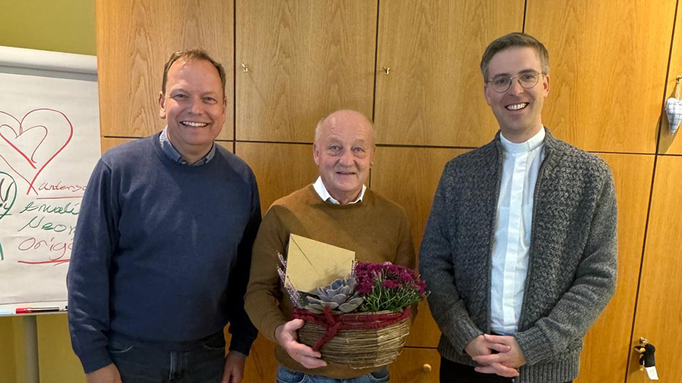 Einen freudigen Anlass hatte die Kirchenverwaltung St. Georg am Beginn ihrer Sitzung vergangenen Mittwochabend. Im Namen des Gremiums konnte Stadtpfarrer Thomas Peter Kopp, zusammen mit Kirchenpfleger Michael Kippes, Herrn Martin Staffe nachträglich zu seinem „zweiten 35. Geburtstag“ ganz herzlich gratulieren, ihm die besten Segenswünsche überbringen und die Gelegenheit nutzen, den Dank für sein vielfältiges Engagement in der Stadtpfarrei auszusprechen.