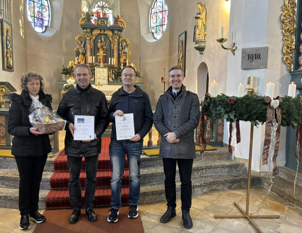 Schließlich gratulierte Pfarrer Kopp auch Bernhard Schmauß, der bereits seit 50 Jahren als Organist tätig ist. Schmauß hatte vor zwei Jahren anlässlich seines 60. Geburtstags eine Urkunde des Bischofs erhalten, sein langjähriges Wirken wurde nun erneut gewürdigt.